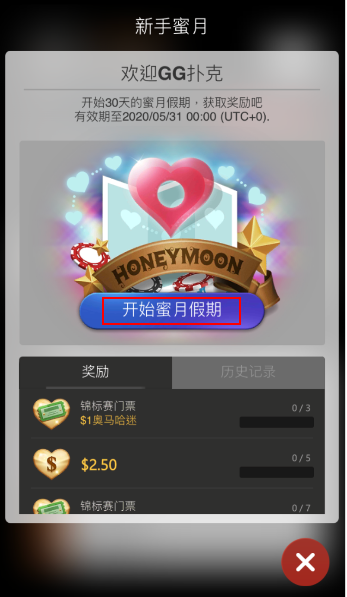 自第一次登录起将提供7天的开始蜜月选项,您需要在游戏页面”我”的下方,透过新手蜜月按钮启动任务。