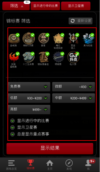 您可以透过锦标赛页面上方的筛选工具,来快速的找到您想参加的比赛