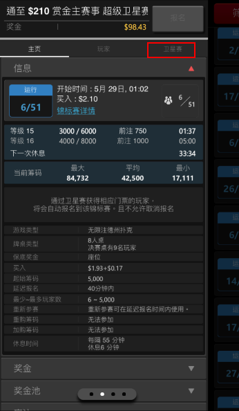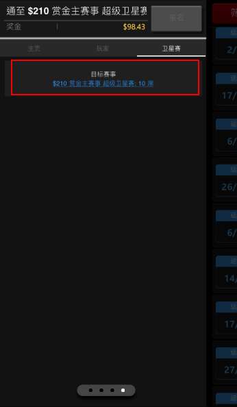 若您参加的比赛是属于卫星赛或晋级赛,您可以透过卫星赛按钮,查看对应的目标赛事。或是您参加的主赛有任何的卫星赛,也可以使用此功能,查看与该目标赛事相关的所有卫星赛。