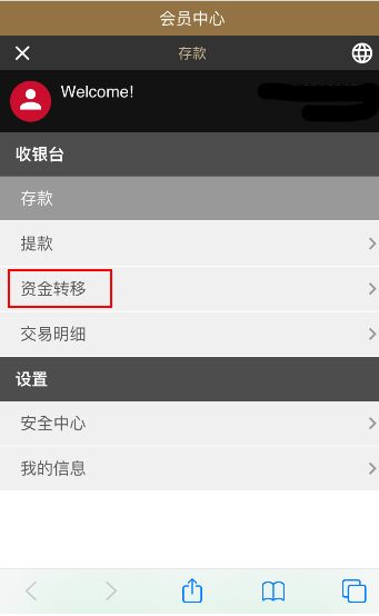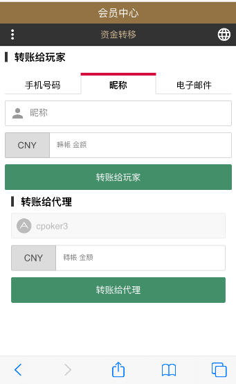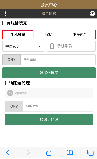 您可以使用会员中心内的功能进行资金转移,请留意,转帐账号与收款账号都需要完成电话与邮箱验证,才能够使用此功能。 可以使用收款号的注册电话,游戏昵称与电子邮箱来进行转移