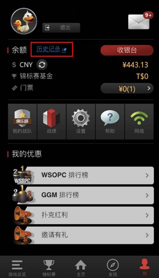 历史纪录:可以查询任何系统自动派发的奖励,比赛买入,牌桌买入等资讯,如有任何游戏退款,也会显示在此功能页面。