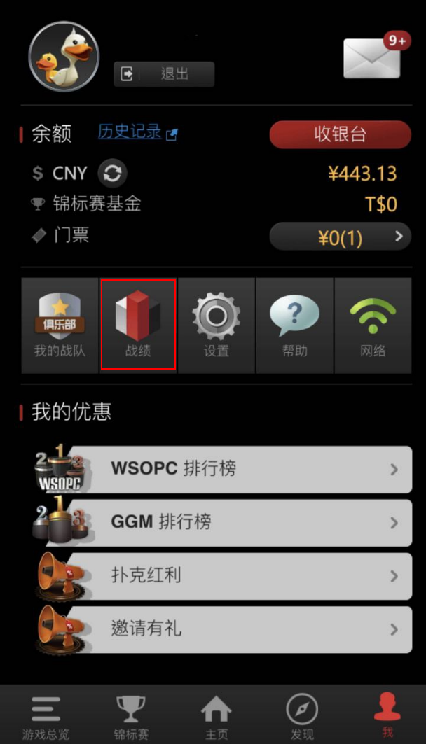 战绩可以查看所有历史牌局记录,只要至【我】的页面,点击【战绩】功能,即可查询每一手牌的记录
